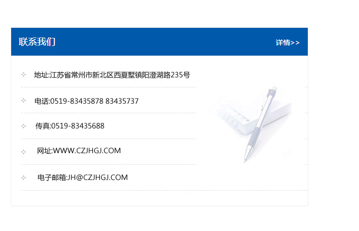 地址:常州市新北區友邦商務大廈1幢16、17層  電話:0519-85101652  傳真:0519-85112595  郵編:213022  網址:www_cz-jiayue_cn.xcjszy.com  郵箱:xiajifengaa@163.com